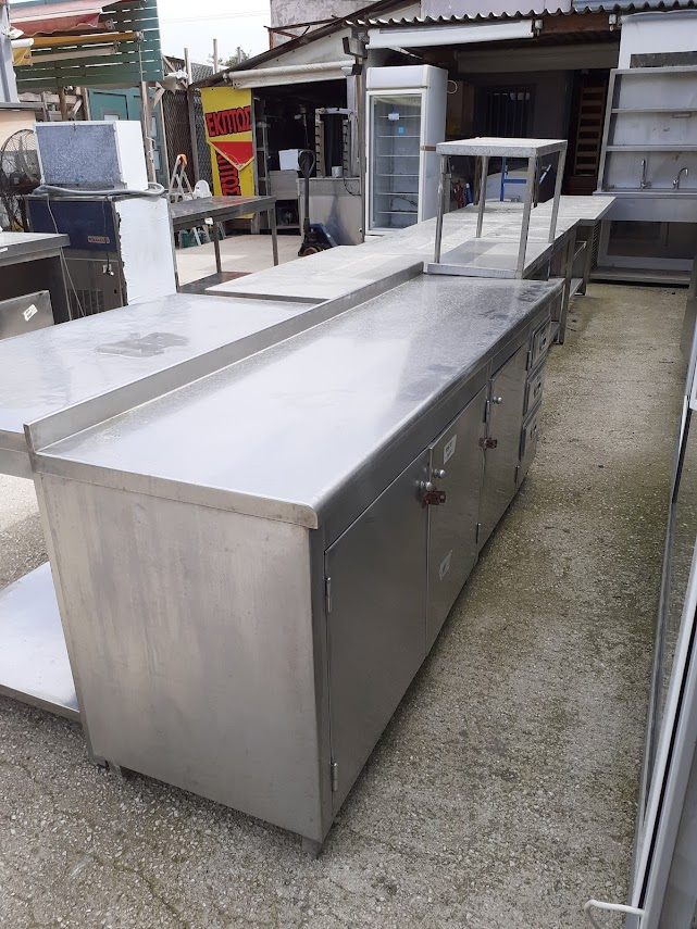 Μεταχειρισμένος, ανοξείδωτος πάγκος ερμάριο, με 3 ανοιγόμενες πόρτες και 3 συρτάρια. Σε καλή κατάσταση. Διαστάσεις: 220x60x85εκ.