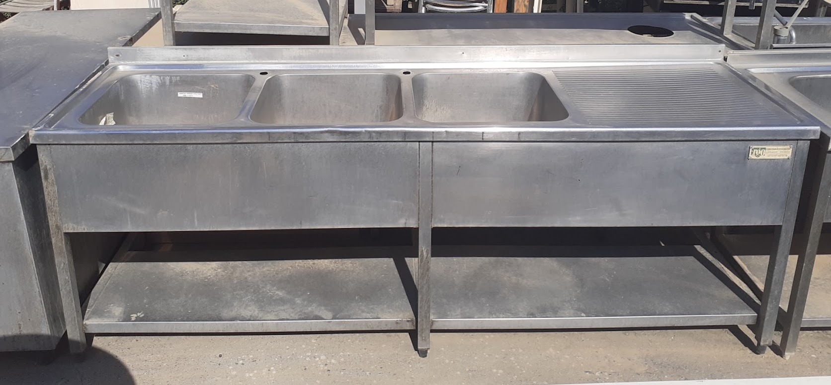 Μεταχειρισμένη λάντζα τριπλή inox, με τρεις γούρνες και επιφάνεια αποστράγγισης. Διαθέτει κάτω ράφι για αποθήκευση. Σε καλή κατάσταση. Διαστάσεις: 240x70x92 εκ. Τιμή: 700€/τμχ.