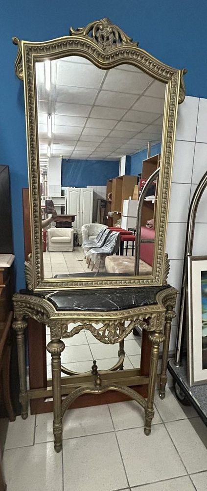 Μεταχειρισμένη κονσόλα με καθρέπτη, σε χρώμα χρυσαφί και με πολλες σκαλιστές λεπτομέρειες. Σε καλή κατάσταση. Διαστάσεις: 102x36x86εκ.