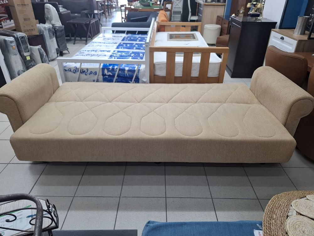 Μεταχειρισμένος καναπές κρεβάτι, μπεζ χρώμα. Διαθέτει αποθηκευτικό χώρο. Σε καλή κατάσταση. Διαστάσεις: 228×70 εκ (κλειστός) και 228×100 εκ (ανοιχτός). Τιμή: 150€/τμχ.