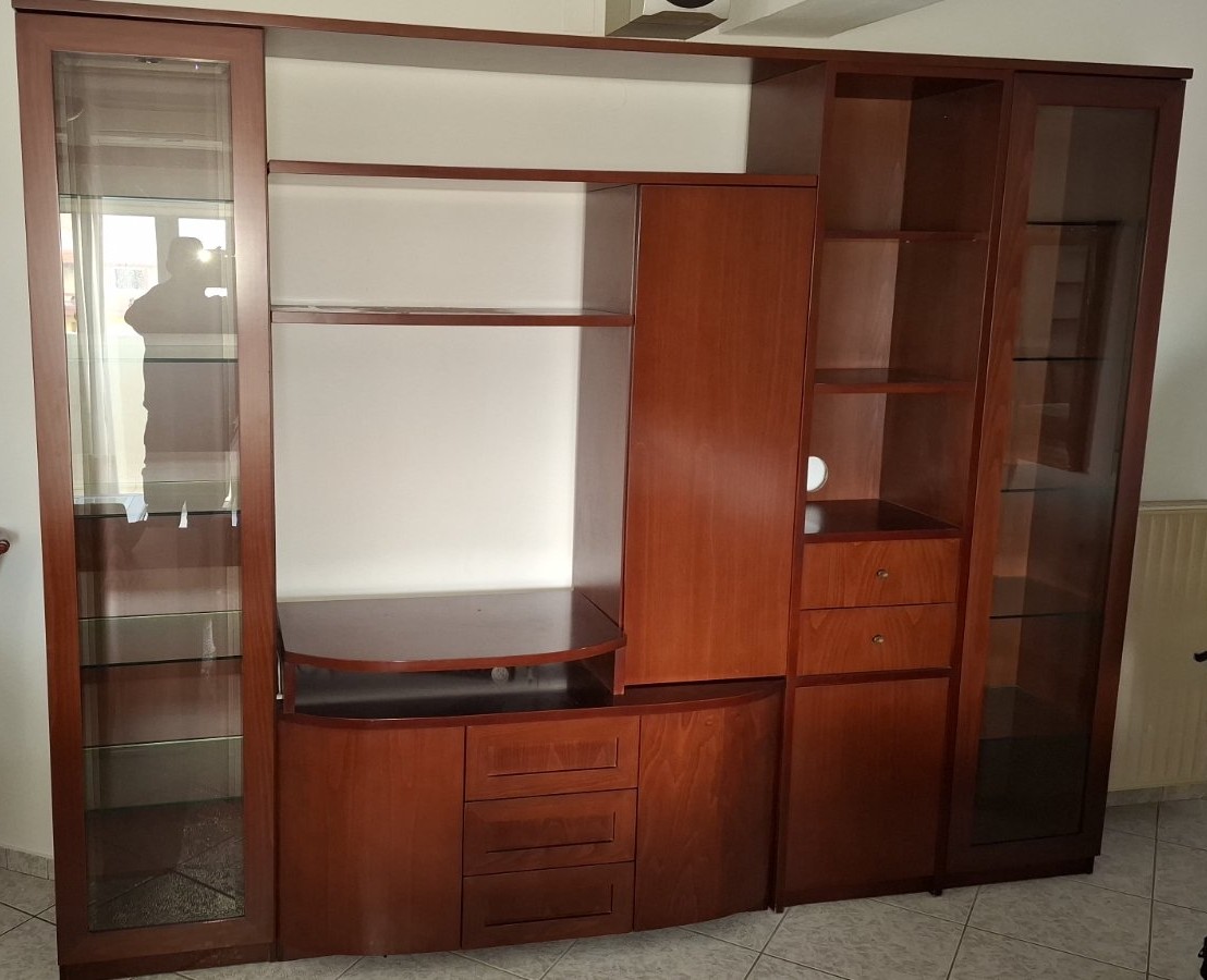 Μεταχειρισμένη σύνθεση σαλονιού από μασίφ ξύλο, με βιτρίνες και ράφια από ξύλο και τζάμι. Σε άριστη κατάσταση. Διαστάσεις: 281x229x39 εκ. Τιμή: 700€.