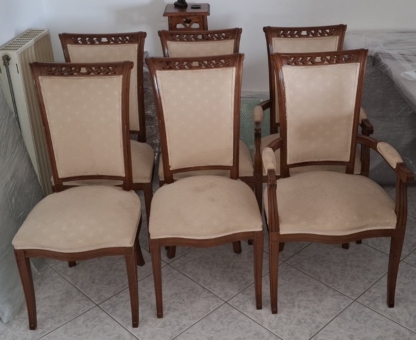 Μεταχειρισμένες καρέκλες από μασίφ ξύλο, με υφασμάτινο κάθισμα και πλάτη. Δύο από τα έξι τεμάχια έχουν και μπράτσο. Σε άριστη κατάσταση. Τιμή συνολική: 800€