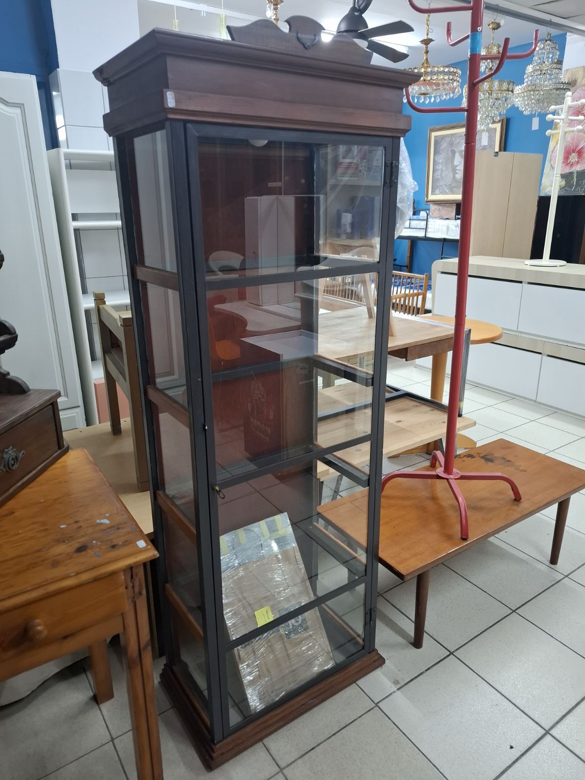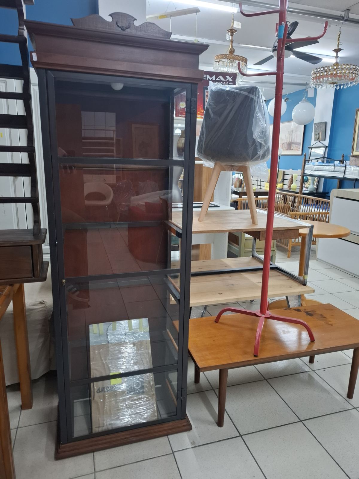 Μεταχειρισμένη ξύλινη προθήκη με ράφια από τζάμι και σκαλιστές λεπτομέρειες. Σε καλή κατάσταση. Διαστάσεις: 61x35x170 εκ.