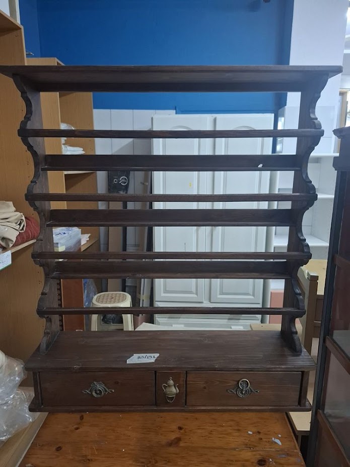 Μεταχειρισμένη, ξύλινη, παραδοσιακή πιατοθήκη, με 2 συρταράκια και 3 ράφια. Σε καλή κατάσταση. Διαστάσεις: 90x21x101 εκ.