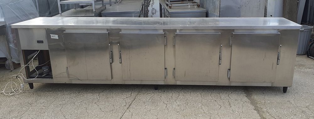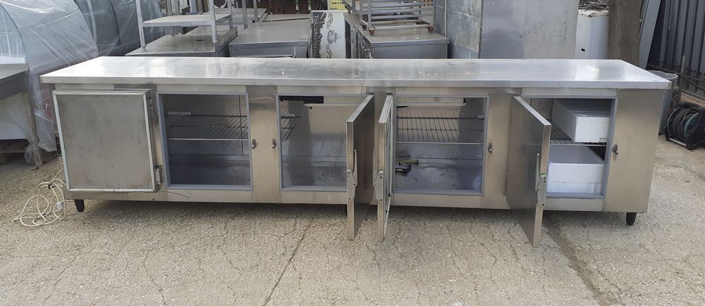 Μεταχειρισμένο επαγγελματικό, ανοξείδωτο ψυγείο πάγκος, τετράπορτο, με ενσωματωμένο μοτέρ. Σε καλή κατάσταση. Διαστάσεις: 350x70x91 εκ. Τιμή: 800€/τμχ.