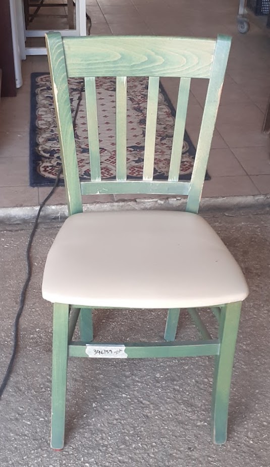 Μεταχειρισμένη, ξύλινη καρέκλα, σε πράσινο χρώμα και μπεζ μαξιλαράκι δερματίνης. Σε καλή κατάσταση. Τιμή: 25€/τμχ.
