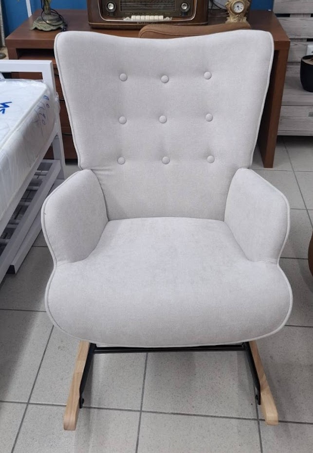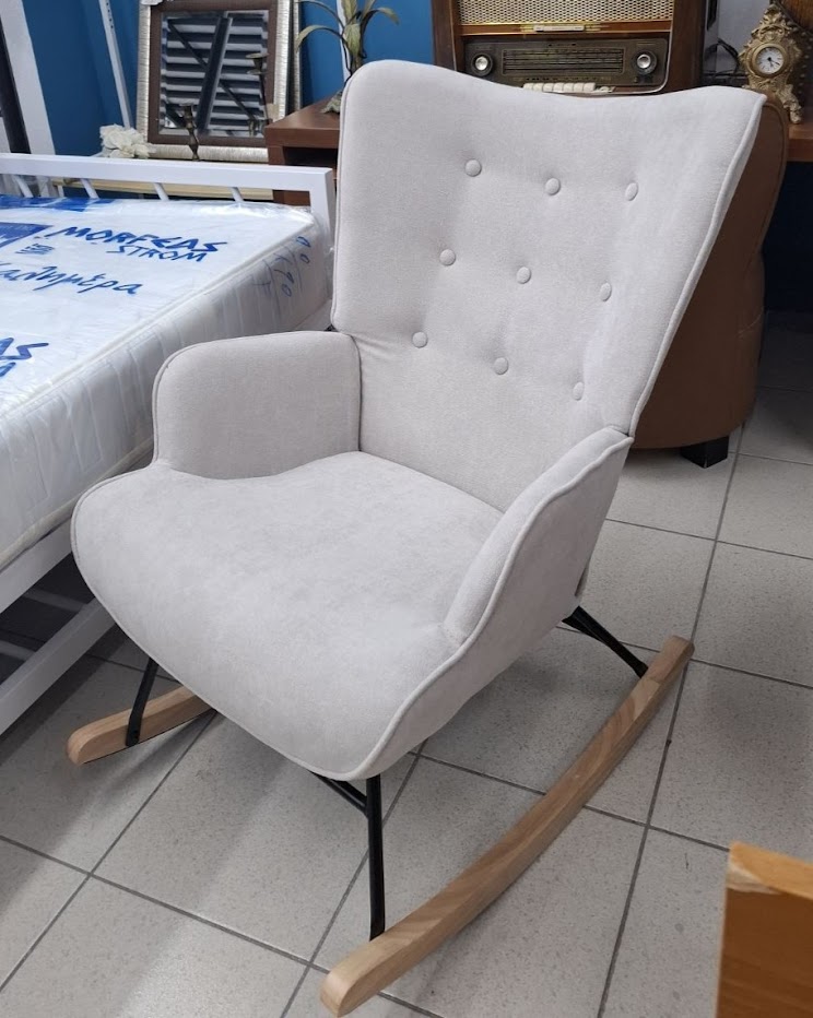 Καινούργια κουνιστή πολυθρόνα, με μεταλλικό σκελετό βάσης και δύο ξύλινα πόδια από rubberwood σε φυσικό χρώμα. Ύφασμα ανοιχτό γκρι χρώμα. Διαστάσεις: 75x71x95 εκ.