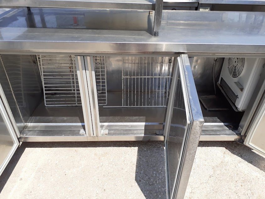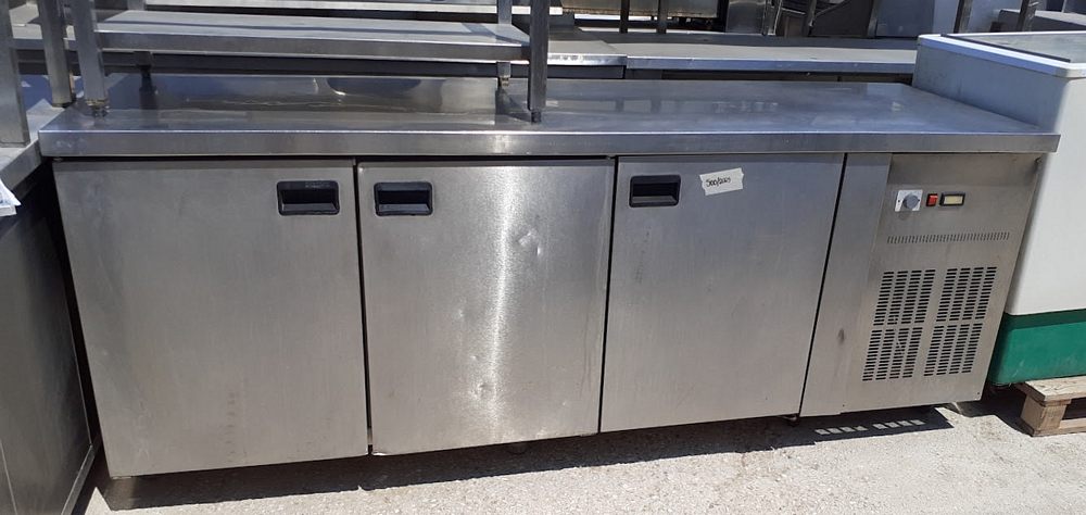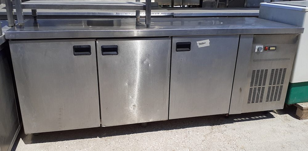 Μεταχειρισμένο ανοξείδωτο ψυγείο πάγκος, με τρεις ανοιγόμενες πόρτες και ενσωματωμένο μοτέρ. Σε καλή κατάσταση.
