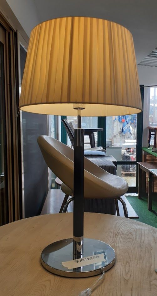 Μεταχειρισμένο επιτραπέζιο φωτιστικό με ανοξείδωτη βάση και υφασμάτινο καπέλο σε χρώμα μπεζ. Σε άριστη κατάσταση. Τιμή: 50€/τμχ.