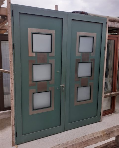 Μεταχειρισμένη, δίφυλλη πόρτα εισόδου, αλουμινίου, πράσινο χρώμα, με φεγγίτες. Σε καλή κατάσταση. Διαστάσεις: 207×250εκ.