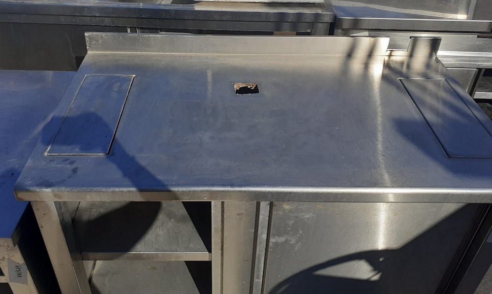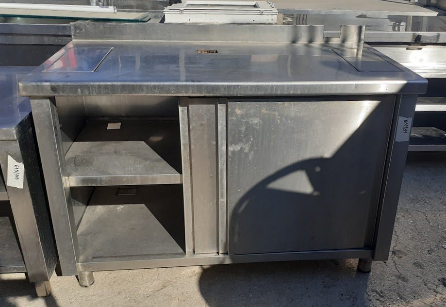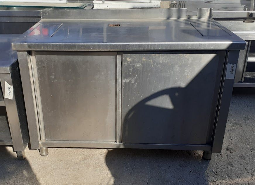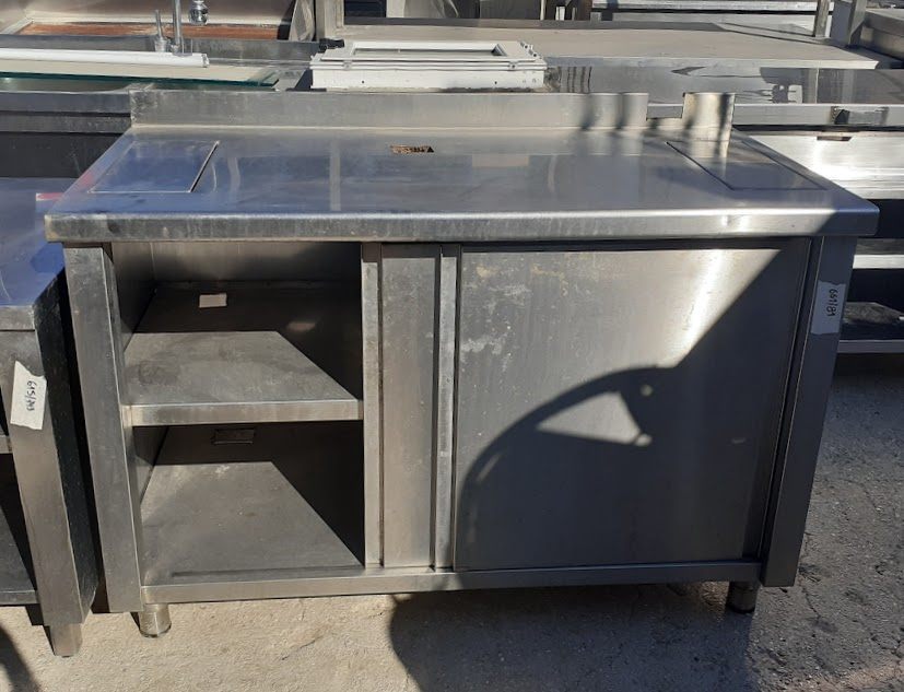 Μεταχειρισμένος, ανοξείδωτος πάγκος ερμάριο, με δύο συρόμενες πόρτες. Σε καλή κατάσταση. Διαστάσεις: 130x70x88εκ.