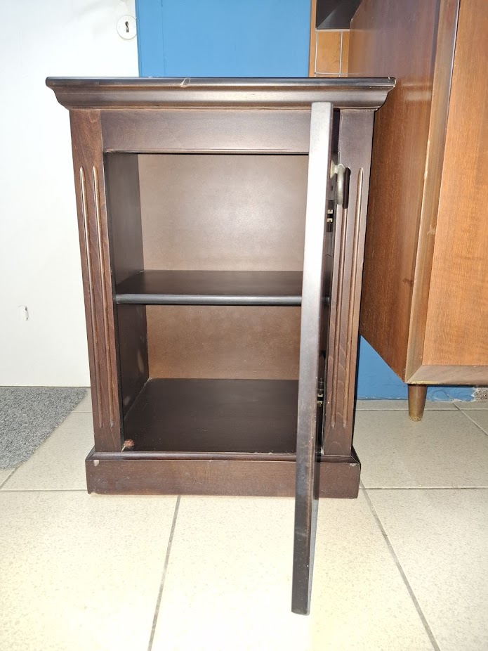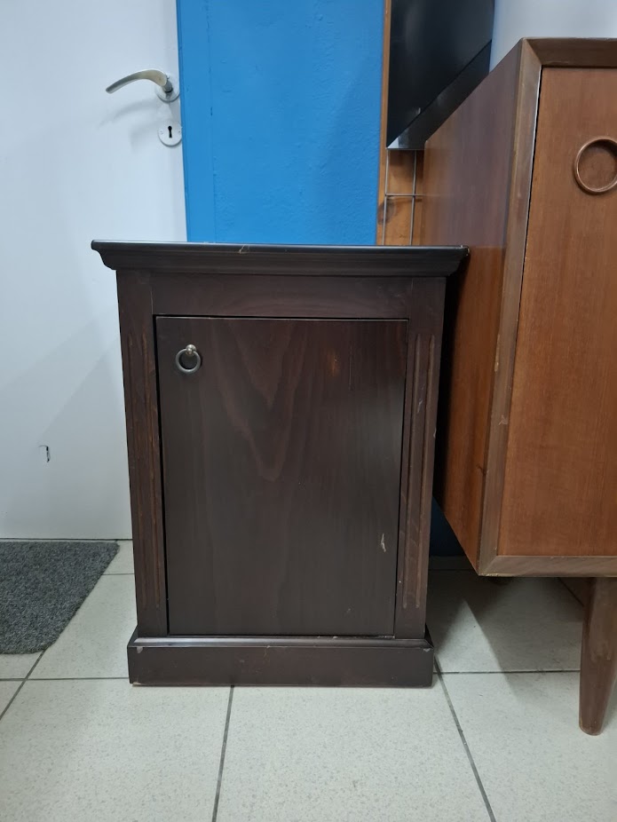 Μεταχειρισμένo ξύλινο κομοδίνο, σκούρο καφέ χρώμα, με ένα μεγάλο ντουλάπι. Σε καλή κατάσταση. Διαστάσεις: 49x39x65εκ. Τιμή: 30€/τμχ.