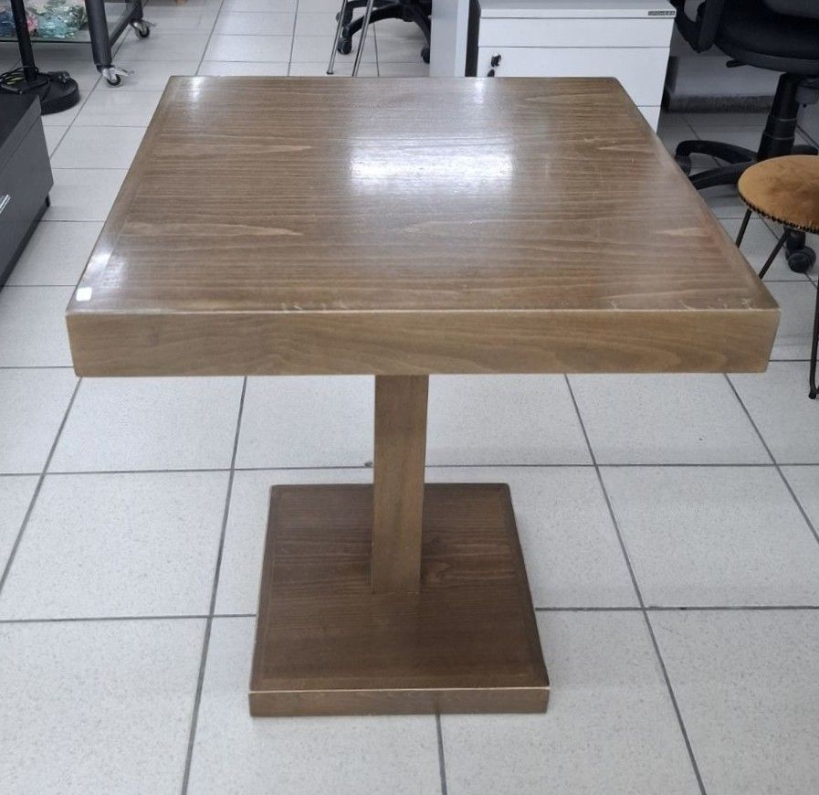 Μεταχειρισμένo τραπέζι καφετέριας, καφέ χρώμα, με ξύλινη βάση και ξύλινο καπάκι. Σε καλή κατάσταση. Διαστάσεις: 64x64x74 εκ. Τιμή: 40€/τμχ.