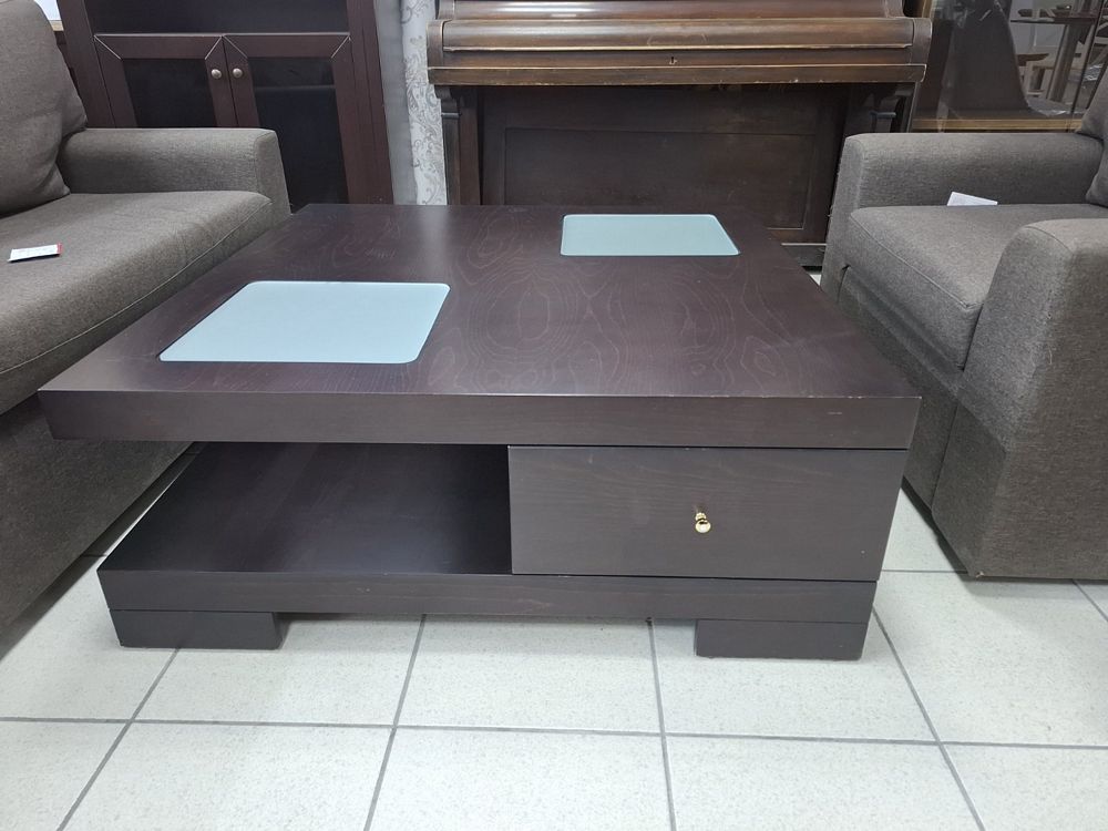 Μεταχειρισμένο τραπέζι σαλονιού, σκούρο καφέ χρώμα με μοντέρνο σχεδιασμό και λεπτομέρειες με γυαλί στην επιφάνεια και ένα συρτάρι. Σε καλή κατάσταση. Διαστάσεις: 99.5×99.5×40 εκ.
