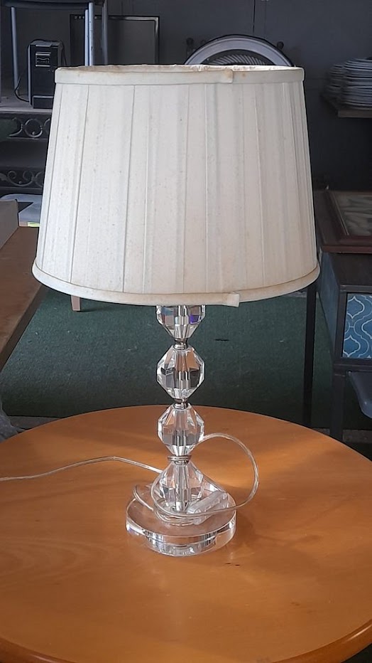 Μεταχειρισμένο, επιτραπέζιο φωτιστικό, ύψους 53εκ., με κρυστάλλινη βάση και υφασμάτινο καπέλο. Σε καλή κατάσταση.