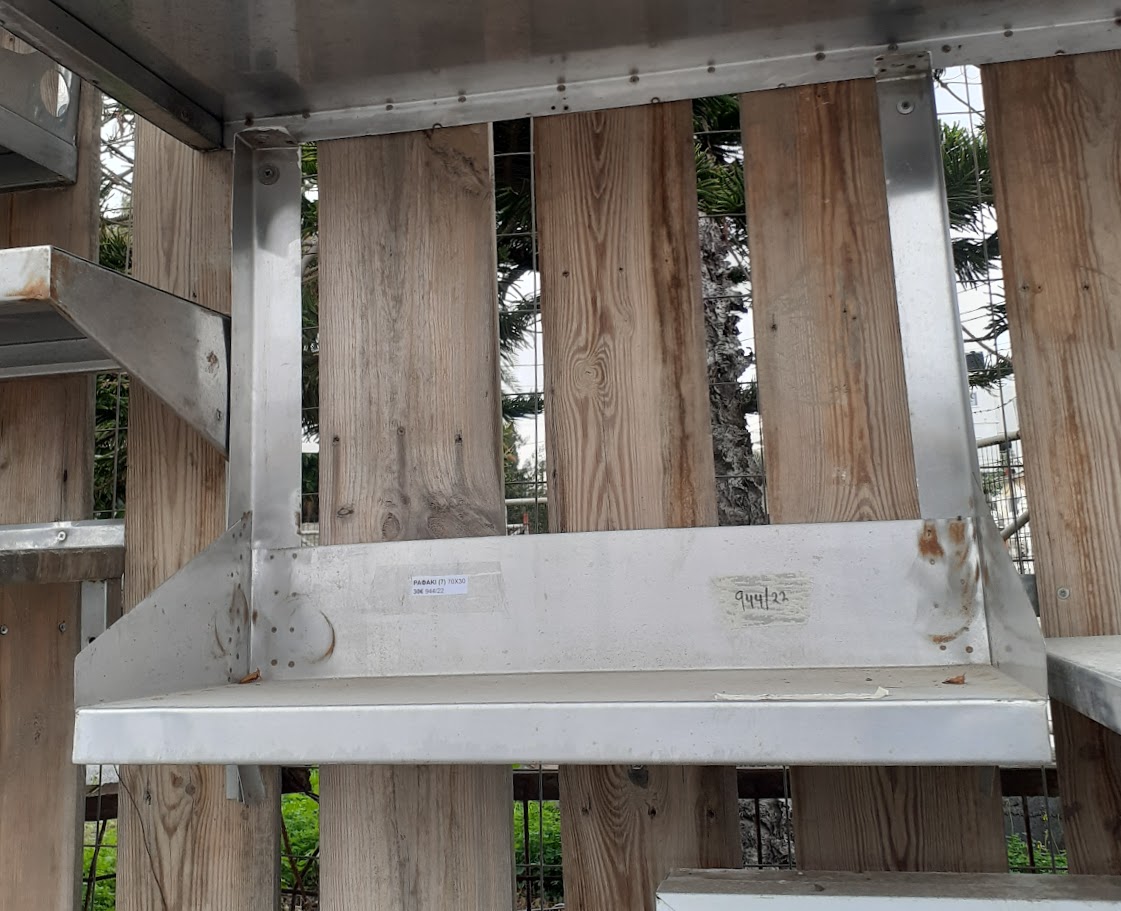 Μεταχειρισμένο, επιτοίχιο ράφι, ανοξείδωτο, υψηλής αντοχής. Κατάλληλο για χώρους εστίασης και επαγγελματικές κουζίνες. Σε καλή κατάσταση. Διαστάσεις: 70×30 εκ.  Τιμή: 30€/τμχ.