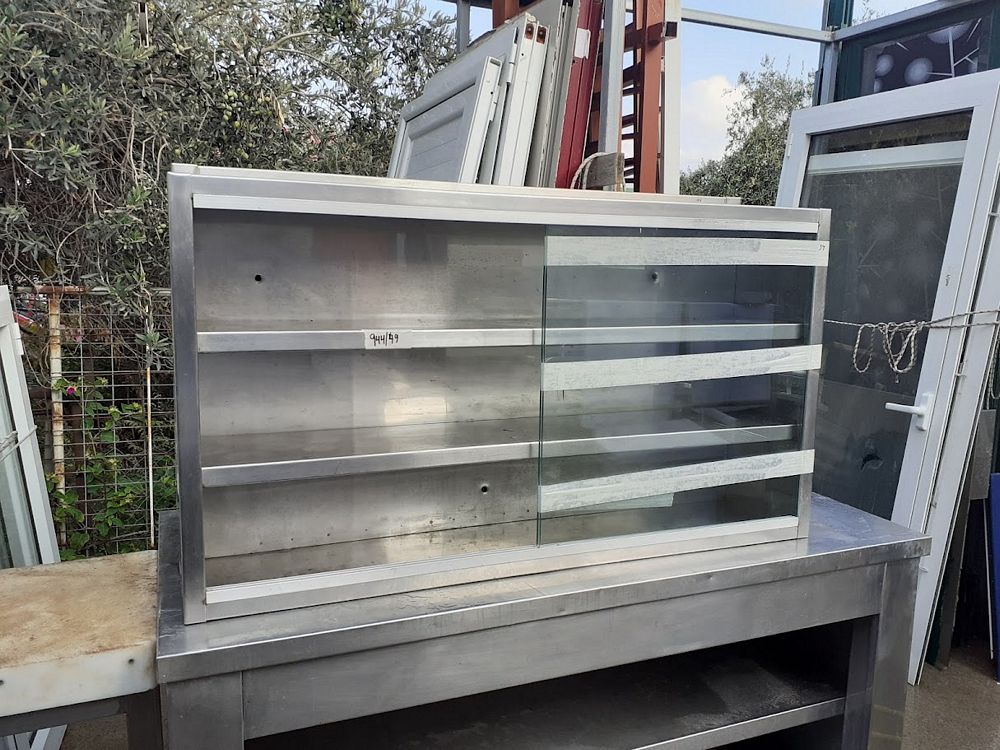 Μεταχειρισμένη πιατοθήκη τοίχου, ανοξείδωτης κατασκευής. Διαθέτει δύο ράφια και συρόμενες γυάλινες πόρτες. Σε καλή κατάσταση. Διαστάσεις: 120x28x67 εκ. Τιμή: 250€/τμχ.